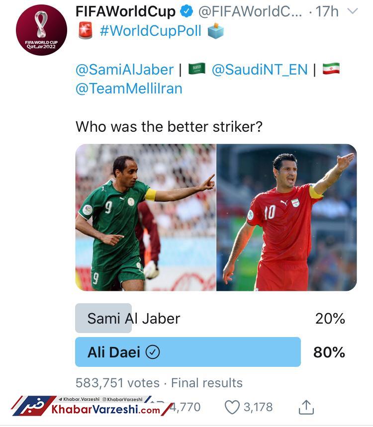 صفحه رسمی فیفا در توئیتر در یک نظرسنجی از مخاطبانش خواسته بود تا بین علی دایی و سامی الجابر یک کدام را به عنوان مهاجم برتر انتخاب کنند.