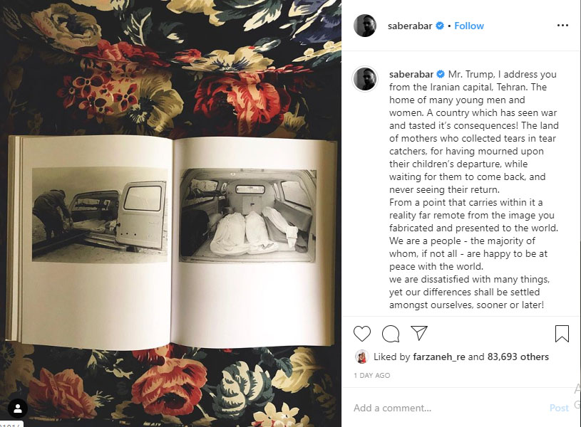 صابر ابر، بازیگر و کارگردان تئاتر و سینما در حساب اینستاگرامی خود با انتشار تصویری از عکاسان هشت سال دفاعمقدس خطاب به ترامپ نامه شدید اللحنی نگاشته است. در بخشهایی از این نامه آمده است:
