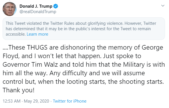 دونالد ترامپ در پی تظاهرات مردم آمریکا به خاطر کشته شدن جورج فلوید در توییتی نوشت: «اراذل و اوباش در حال اهانت به یاد و خاطره جورج فلوید هستند و به همین دلیل نیروهای گارد ملی آمریکا را به این شهر میفرستم. وقتی غارت‎ها شروع شود، تیراندازی هم آغاز می‌شود»
