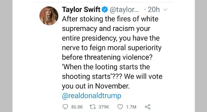 طی یک روز گذشته، تویٔیت جنجالی و ضد ترامپ تیلور سویٔیفت، خواننده و بازیگر معروف آمریکایی در بسیاری رسانه‌های دنیا منتشر شده است