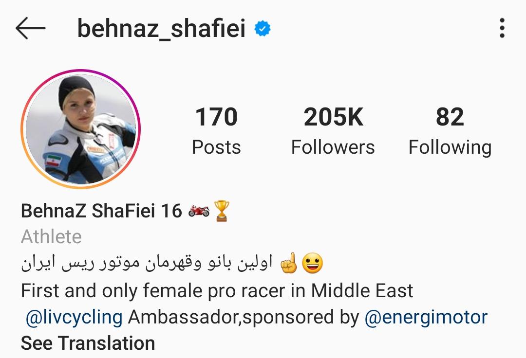 بهناز شفیعی، 31 ساله، تابستان ۹۴ به عنوان اولین و تنها زن موتورسوار، توانست مجوز ورود به پیست استاندارد آزادی را به همراه آقایان دریافت کند و دورههای حرفهای موتور ریس را بگذراند و تنها گواهی نامه موتورسواری حرفهای بانوان را از فدراسیون ایران دریافت کند. او در ۱۵ بهمن سال ۹۵ به عنوان مسئول کمیته موتور ریس بانوان استان البرز اولین مسابقه رسمی موتور ریس بانوان را برگزار و در آن مسابقه مقام قهرمانی را کسب کرد. این را هم بدانید که بهناز در فیلم آذر مربی آموزش موتورسواری نیکی کریمی و بدلکار او بود. موتور، جزئی ثابت و جدانشدنی از بیشتر پستهای صفحه شخصی این ورزشکار زن است که بین 20 تا 30 هزار لایک میخورد.