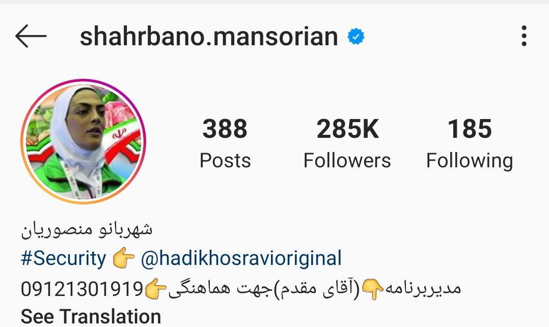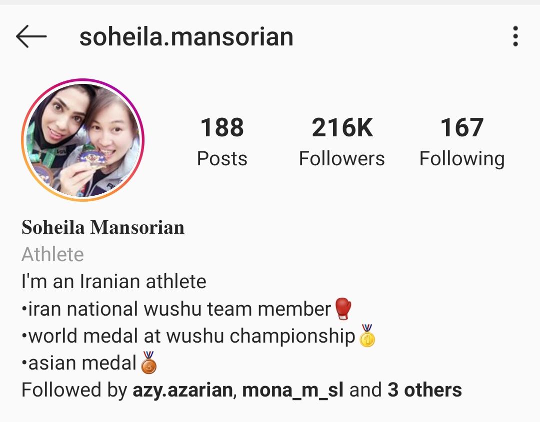 شهربانو منصوریان، 34 ساله و اهل اصفهان است. او حدود ۲۰ سال است که در رشتههای رزمی فعالیت دارد و تا به حال افتخارات زیادی را به همراه دو خواهر دیگرش در ووشو به دست آورده است. شهربانو از ۹ سالگی به ورزشهای رزمی علاقه مند شده و علاوه بر ووشو در رشته کونگفو نیز فعالیت داشته است. این ورزشکار پرطرفدار اینستاگرامی، 5 مدال طلای جهانی، یک مدال طلای جامجهانی، یک نشان طلای آسیا و همچنین چندین قهرمانی کشوری در رشته ووشو بخش ساندا به دست آورده است. شایان ذکر است که الهه و سهیلا منصوریان، خواهران شهربانو و هر سه نابغه ووشوهستند که افتخارات زیادی را در این رشته برای ایران به دست آوردهاند. یکی از نقاط عطف زندگی آنها که منجر به بیشتر شدن محبوبیت و معروفیتشان شده، حضور در برنامه ماهعسل بود، جایی که از دقایق تلخ و حسرتهای دوران کودکیشان گفتند. همچنین «صفر تا سکو» فیلمی است که سال 95 با محوریت زندگی خواهران منصوریان و مسیر پر پیچ و خمشان در دستیابی به موفقیت ساخته شده است. در صفحه شخصی منصوریان علاوه بر پستهایی با محوریت تمرینات ورزشی، عکسهای زیادی از پسرش هم وجود دارد که نشان دهنده علاقه او به خانواده است. پستهای اخیر او تا 200 هزار لایک هم خورده اما معمولا کامنت زیادی ندارد.