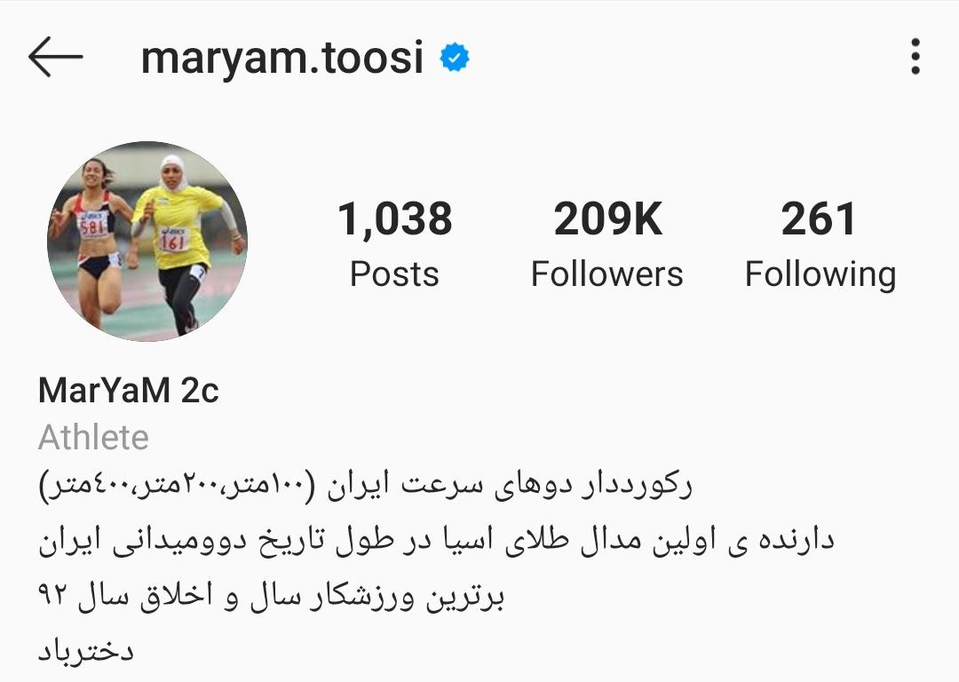 یکی از دوندههای زن ایرانی که دنبال کنندگان زیادی در اینستاگرام دارد، مریم طوسی است. طوسی رکورددار دوهای ۱۰۰ متر، ۲۰۰ متر و ۴۰۰ متر زنان ایران است. دو مدال طلای قهرمانی داخل سالن آسیا در دوی ۴۰۰ متر و سه مدال برنز در دوهای ۴ در ۴۰۰ متر امدادی و ۶۰ متر ستارگان آسیا را بهدست آورده و بهترین ورزشکار و بهترین ورزشکار اخلاق سال 92 است. بیشتر پستهای این ورزشکار که گاهی تا 100 هزار لایک هم میخورد، نشان دهنده آمادگی بالای جسمانی اوست. شایان ذکر است که مریم طوسی هم به دختر باد معروف است و در بیو اینستاگرامش هم به این نکته اشاره کرده است.
