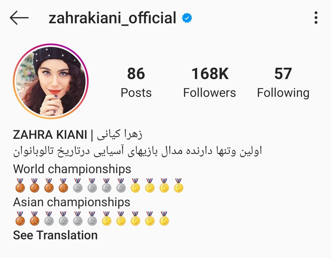 زهرا کیانی 20 ساله، اهل استان چهارمحال و بختیاری و ساکن اصفهان است. او از ۶ سالگی ژیمناستیک کار میکرده و در آن زمان هم قهرمان قهرمانان استان چهارمحال و بختیاری بوده اما بعدتر در ۸ سالگی هنگام اجرای حرکت وارو یکی از دستانش از دو ناحیه شکسته و این آسیب باعث شده دو ماه خانه نشین شود و به طور کلی از رشته ژیمناستیک فاصله بگیرد. اما این فاصله دیری نپایید و شاید اصلا لازم بود تا او به طور خیلی اتفاقی وارد رشته ووشو شود و امروز برایمان افتخار آفرینی کند. وی نخستین بانوی تالوکار ایرانی است که در بخش تالو در رده سنی بزرگ سالان به مدال جهانی دست یافته است. پستهای اینستاگرامی این ورزشکار زن بر خلاف بقیه اعضای این فهرست، بیشتر از لحظات اوقات فراغت و سرگرمیهایش است و کمتر عکسی از لحظات تمرینهای ورزشیاش به چشم میخورد.