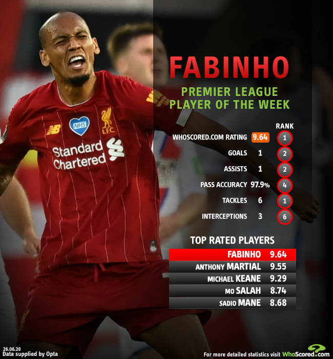 هافبک برزیلی لیورپول بهترین بازیکن هفته سیویکم لیگ برتر جزیره از نگاه هو اسکورد شد.