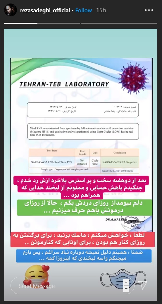 رضا صادقی با انتشار یک استوری در صفحه شخصی اش بهبود بیماری کووید19 خود را اطلاع رسانی کرد.