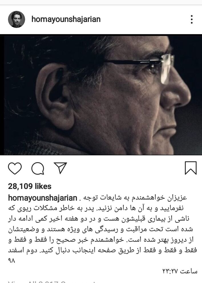 همچنین همایون شجریان فرزند استاد دقایقی قبل با انتشار مطلبی در صفحه شخصی اینستاگرام، نوشت از عزیزان خواهش میکنم به شایعات توجه نکرده و به آنها دامن نزنید.