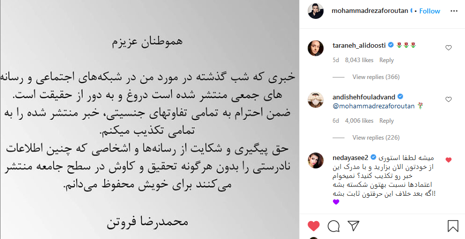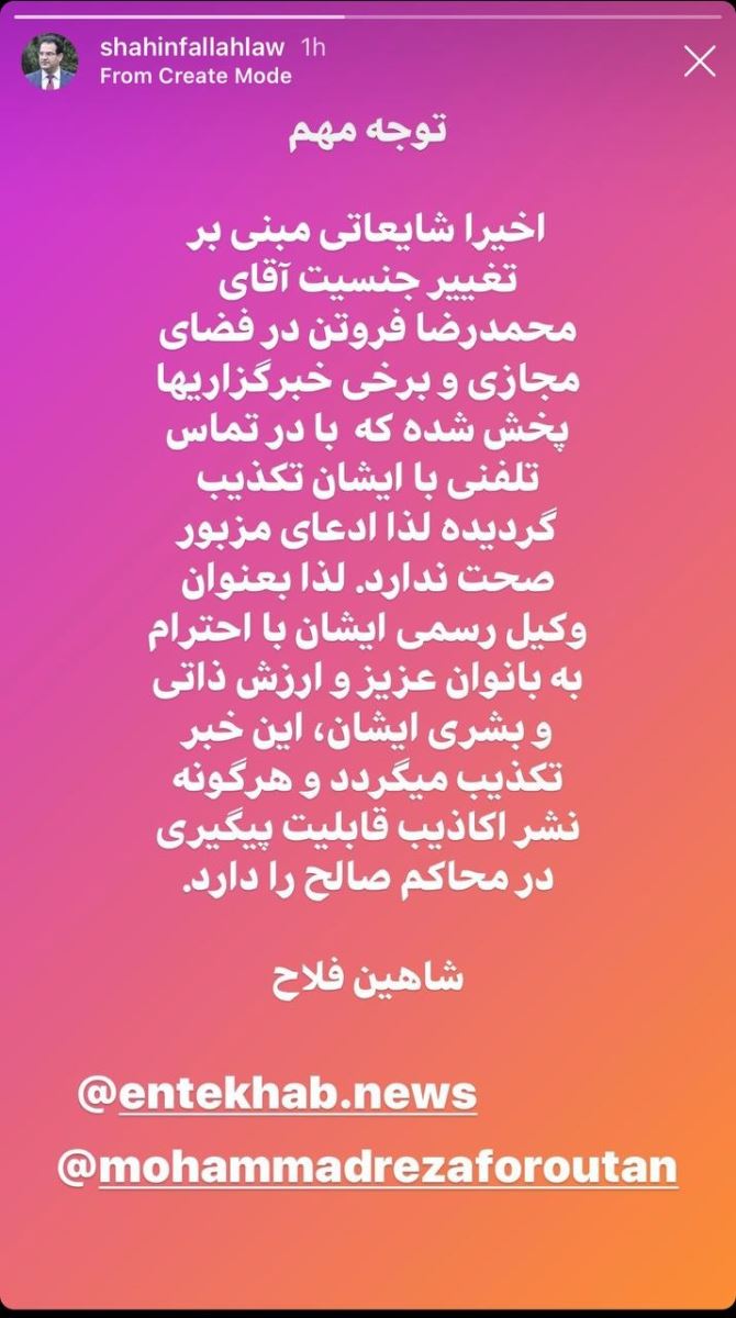 ساعاتی پس از استوری تکذیب این شایعه توسط شاهین فلاح که اداعا کرد وکیل رسمی این بازیگر است، محمدرضا فروتن هم شخصا با انتشار استوری زیر به تمام حواشی بوجود آمده پایان بخشید.