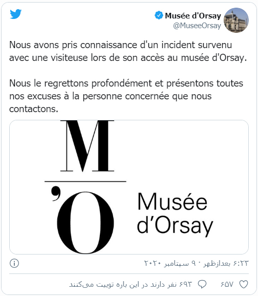 این موزه پس از آن که این زن ماجرا را در شبکههای اجتماعی منتشر کرد، در تماس با این فرد عذرخواهی کرده است.