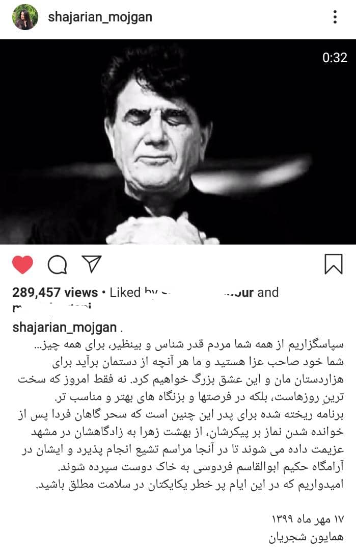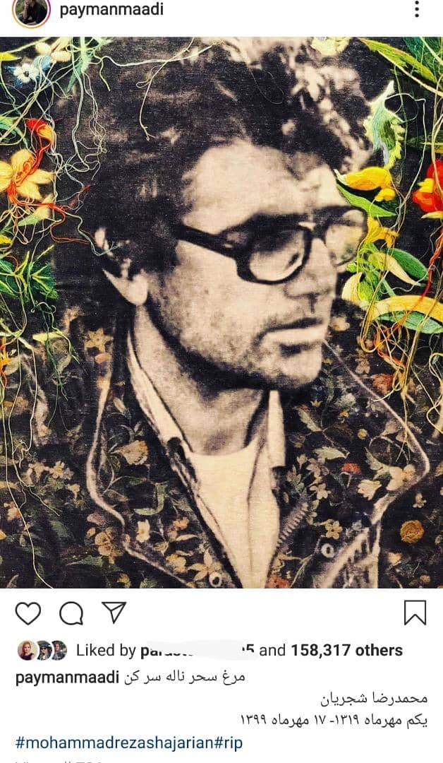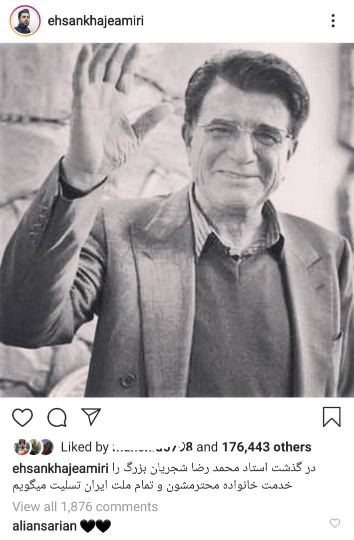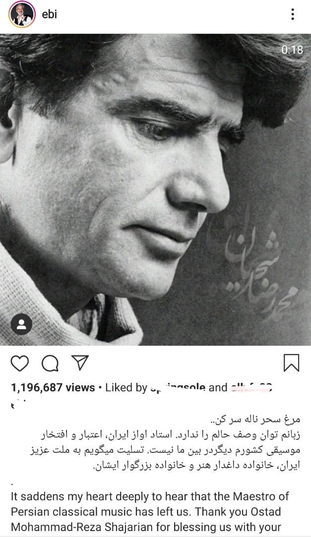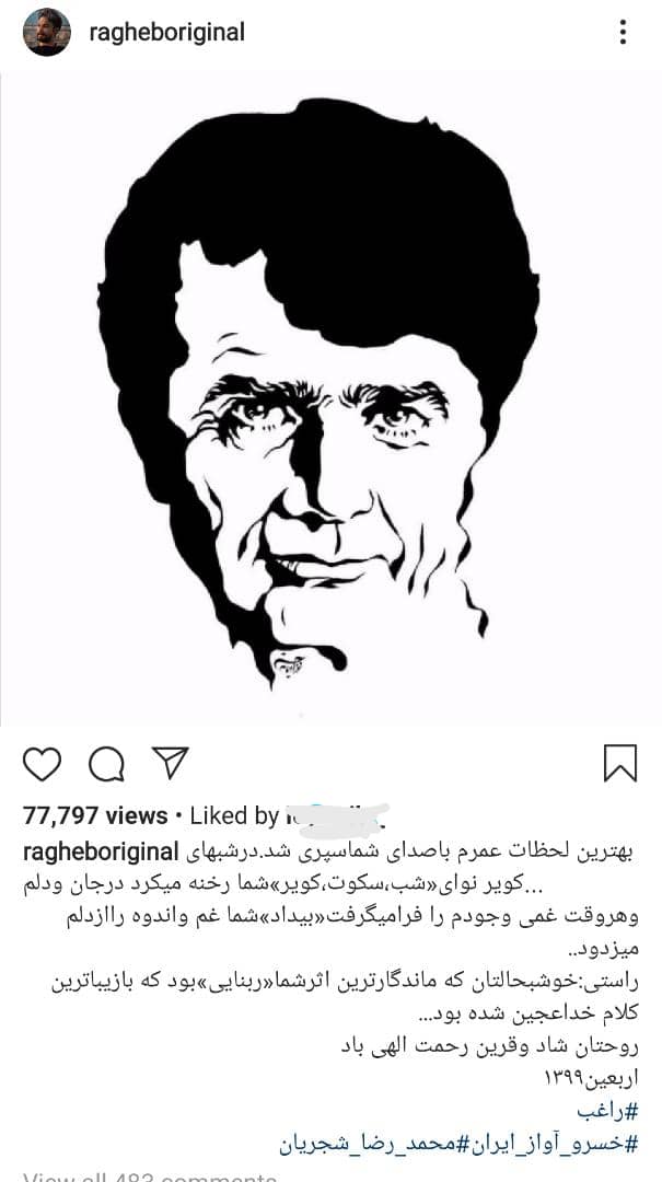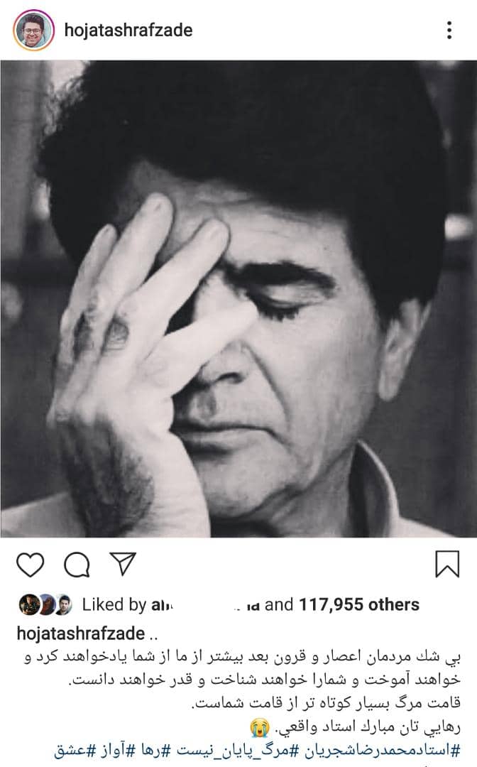 چهره های معروف موسیقی و هنر در ایران و خارج از ایران به درگذشت استاد محمدرضا شجریان واکنش نشان دادند. تعدادی از پست های اینستاگرامی چهره ها را در زیر ببینید.