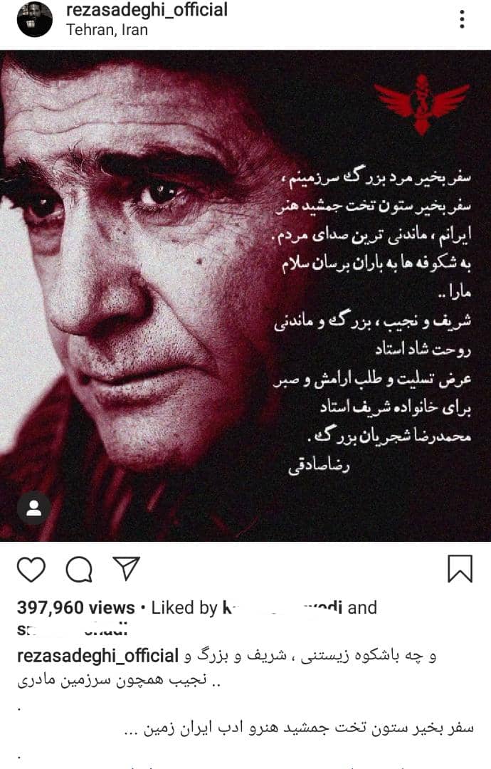پست رضا صادقی در واکنش به درگذشت شجریان