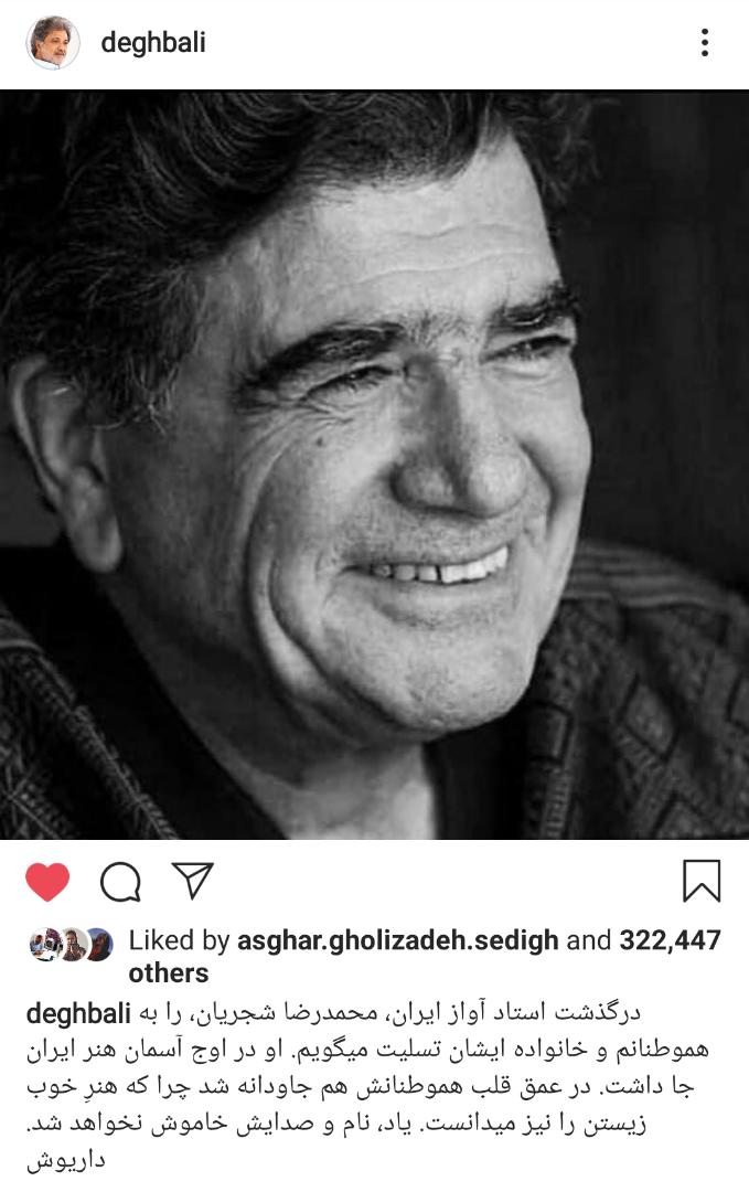 شادمهر عقیلی در پستی به درگذشت استاد آواز ایران واکنش نشان داد