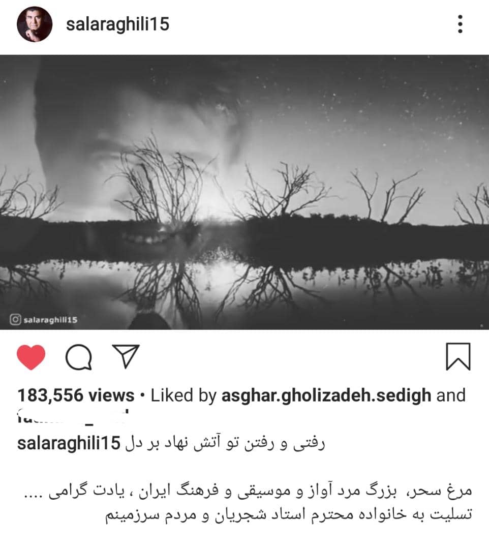 پست اینستاگرامی سالار عقیلی در تسلیت به درگذشت استاد محمدرضا شجریان