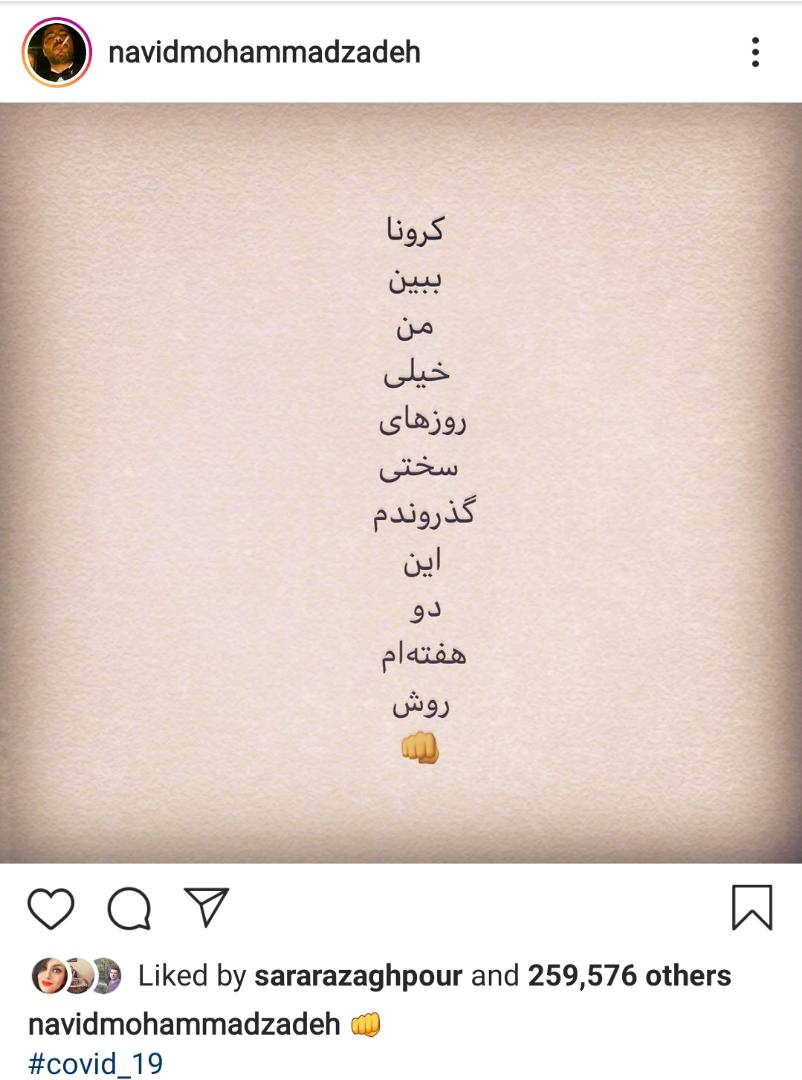 نوید محمدزاده بازیگرجوان و محبوب سینما ایران با انتشار این پست از ابتلای خود به کرونا خبر داد.
