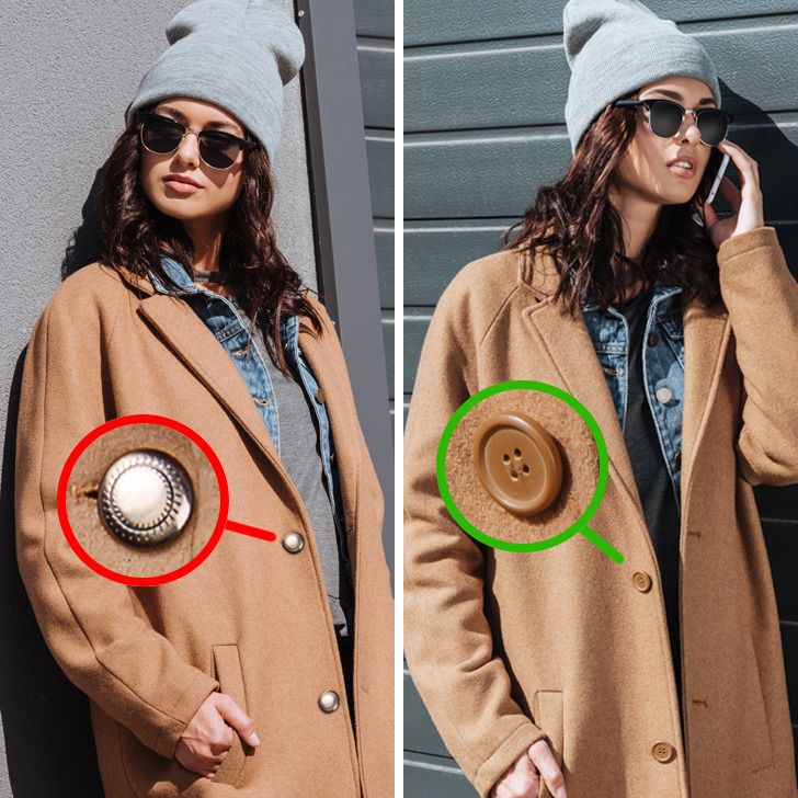 لوازم جانبی لباس مانند دکمه، زیپ، تزیینات و بند در صورت زشت و نامرغوب بودن لباس را ارزان قیمت نشان می دهند. حتی اگر لباس از کیفیت بالا و برش به روز برخوردار باشد. اما این بدان معنی نیست که شما باید از خرید آن امتناع کنید. یافتن یک لباس متناسب با اندام شما گاهی اوقات بسیار دشوارتر از تغییر دکمه های زشت یا فرسوده است. تنبل نباشید و یاد بگیرید اگر لباسی مناسب را یافتید و فقط مشکل آن دکمه یا سایر موارد قابل تعویض بود آن را خریداری کنید و خودتان اقدام به تعویض آن مورد کنید. از اینکه لباس شما با یک تغییر ساده بسیار متحول خواهد شد تعجب خواهید کرد. به عنوان مثال دکمه‌های پالتو و کت های گرانقیمت اغلب از همان رنگ لباس و از پلاستیک یا فلز مرغوب ساخته میشود. شما با خرید یک کت ارزان ولی با رنگ و برش مناسب می توانید آن را تبدیل به مدل های برترین برندها کنید.
