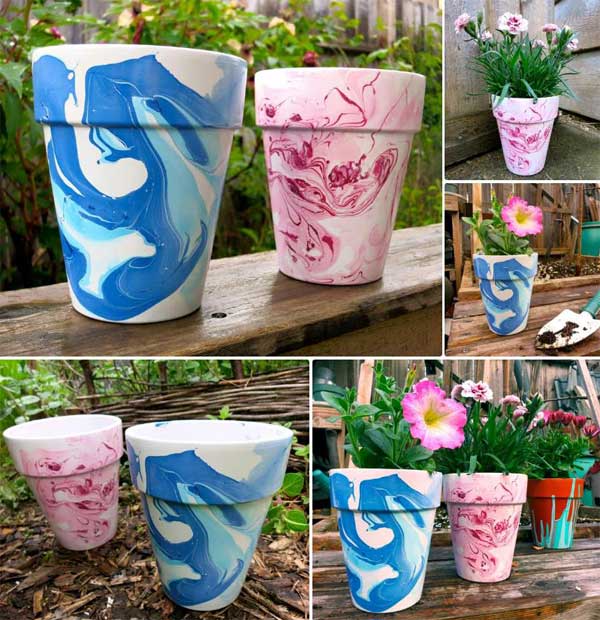 در تزیین گلدان با لاکهای قدیمی با یک تیر دونشان زدهاید، استفاده بهینه از لاکهایی که باید به زباله میرفتند، و زیباتر کردن گلدان های ساده و خسته کننده. در این روش می توانید لاکها را با هم مخلوط کنید، الیته نه به طور کامل، تا جایی که حالت ابر و بادی به خود بگیرد، گلدان را روی یک روزنامه یا زیرانداز نایلونی واژگون کرده و رنگ بدست آمده را روی آن بریزید. اگر حجم لاک موجود کم باشد، می توانید رنگ سفید خریداری کرده و اضافه کنید، این روش ساده تزیین گلدان تغییزی شکفت انگیزی در فضای گلدانها ایجاد خواهد کرد.