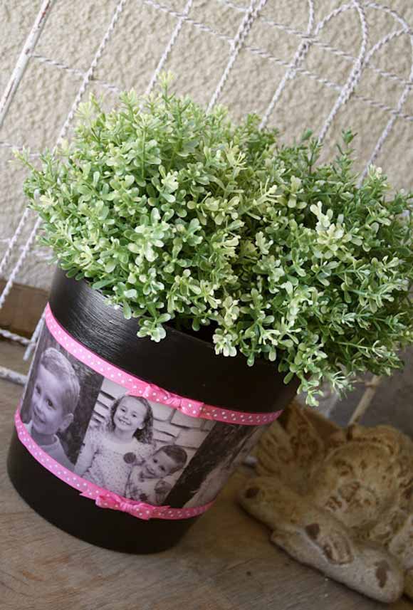 این روش نقاشی و تزیئین گلدان می تواند هدیه مناسبی برای عزیزان باشد. ابتدا گلدان را رنگ کیند، سپس تصاویر خاطره انگیز چاپ شده خود را روی ان بچسبانید و در آخر با روبان یا تور تزئین کنید. این ایده بسیار منحصر بفرد و ارزشمند است،