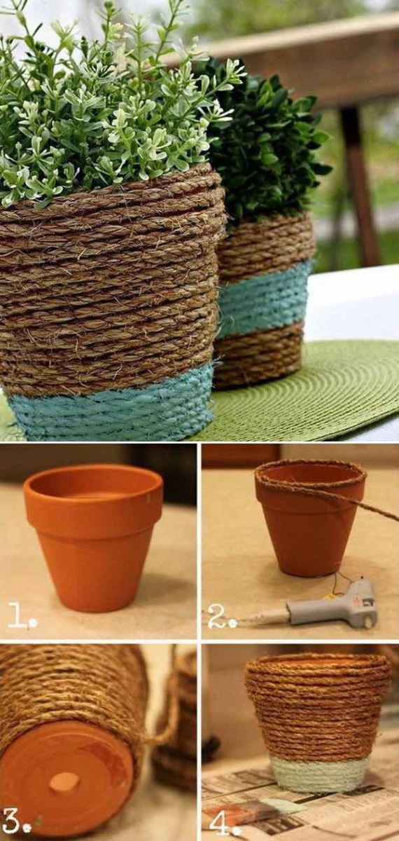 با استفاده از طناب یا نخ های کنفی دور گلدان را به سادهترین روش ممکن تزیین کنید، این روش زیباسازی گلدان های خانگی شاید سادهتری و کم هزینهترین روش برای تغییر شکل یک گلدان ساده پلاستیکی یا سفالی باشد.