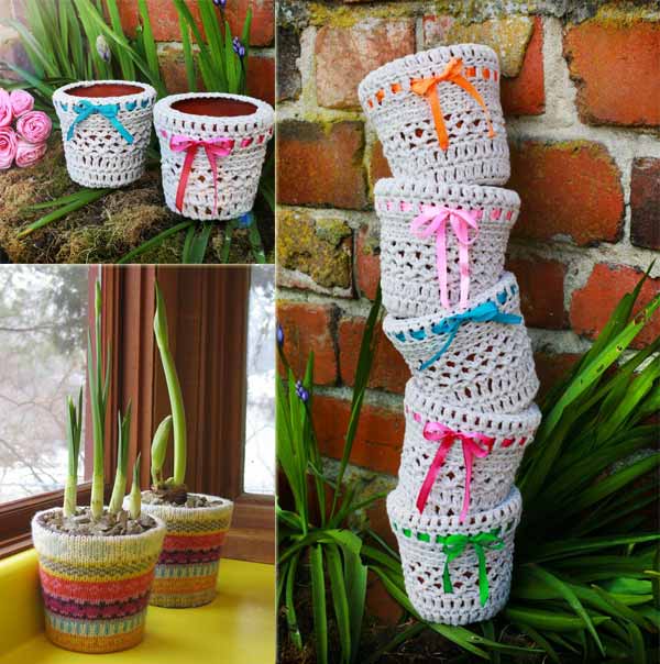 اگر علاقمند با بافتنی یا قلاب بافی هستید، برای گلدان خود لباس ببافید.