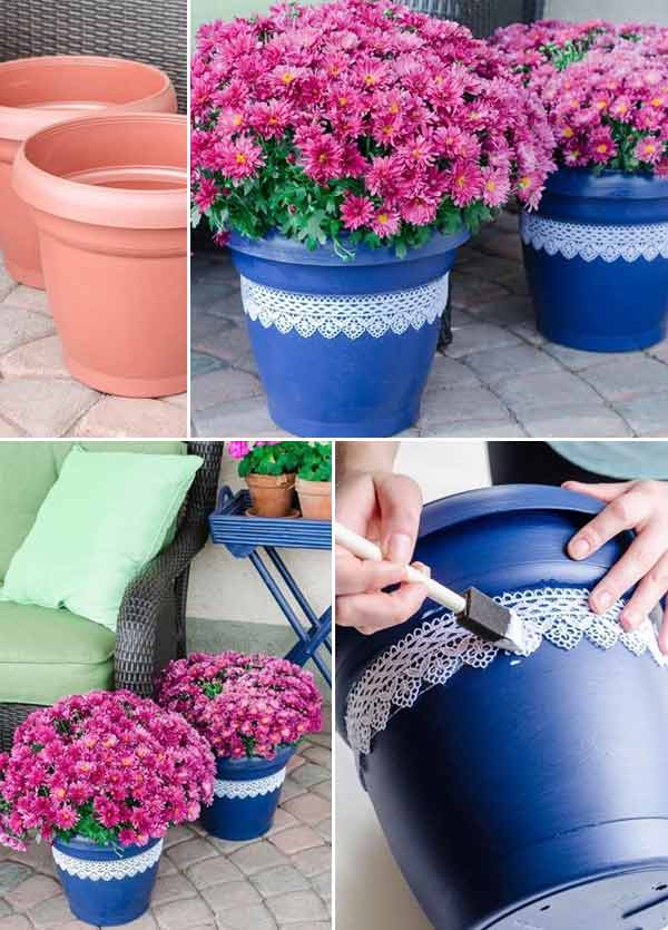 گلدانها را ابتدا با رنگ شاد و تیره رنگ کنید، سپس با استفاده از تور آنها را تزیین کنید، در استفاده از تور می توان از تور لباسهایی که قصد دور انداختن آنها را استفاده کنید یا تور خریداری کنید. با این خلاقیت ساده تاثیر شگرفی در دکوراسیون خود حاصل خواهید کرد.