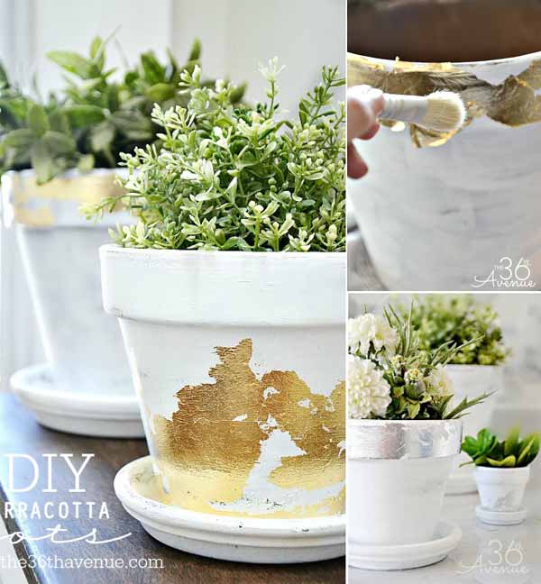 کار با ورق های طلا یا نقره بسیار ساده است، پس از رنگ کردن گلدان سفالی به رنگسفید یا روشنبا استفاده از چسب و ورق فلزی آنها را تزئین کنید.