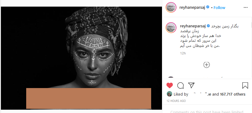 ریحانه پارسا با انتشار عکس نیمه عریانی از خود در اینستاگرام نوشت: