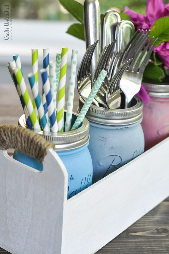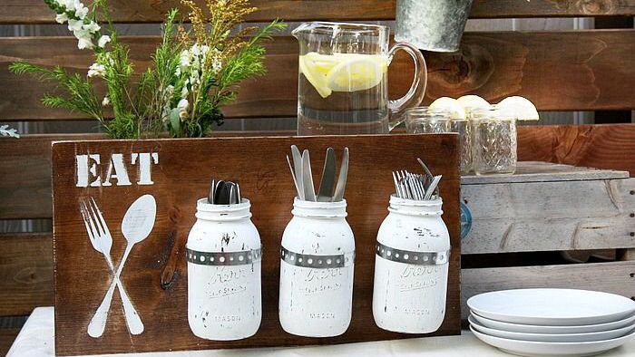 استفاده از شیشه خالی مواد غذایی به عنوان جا قاشق و چنگالی در آشپزخانه