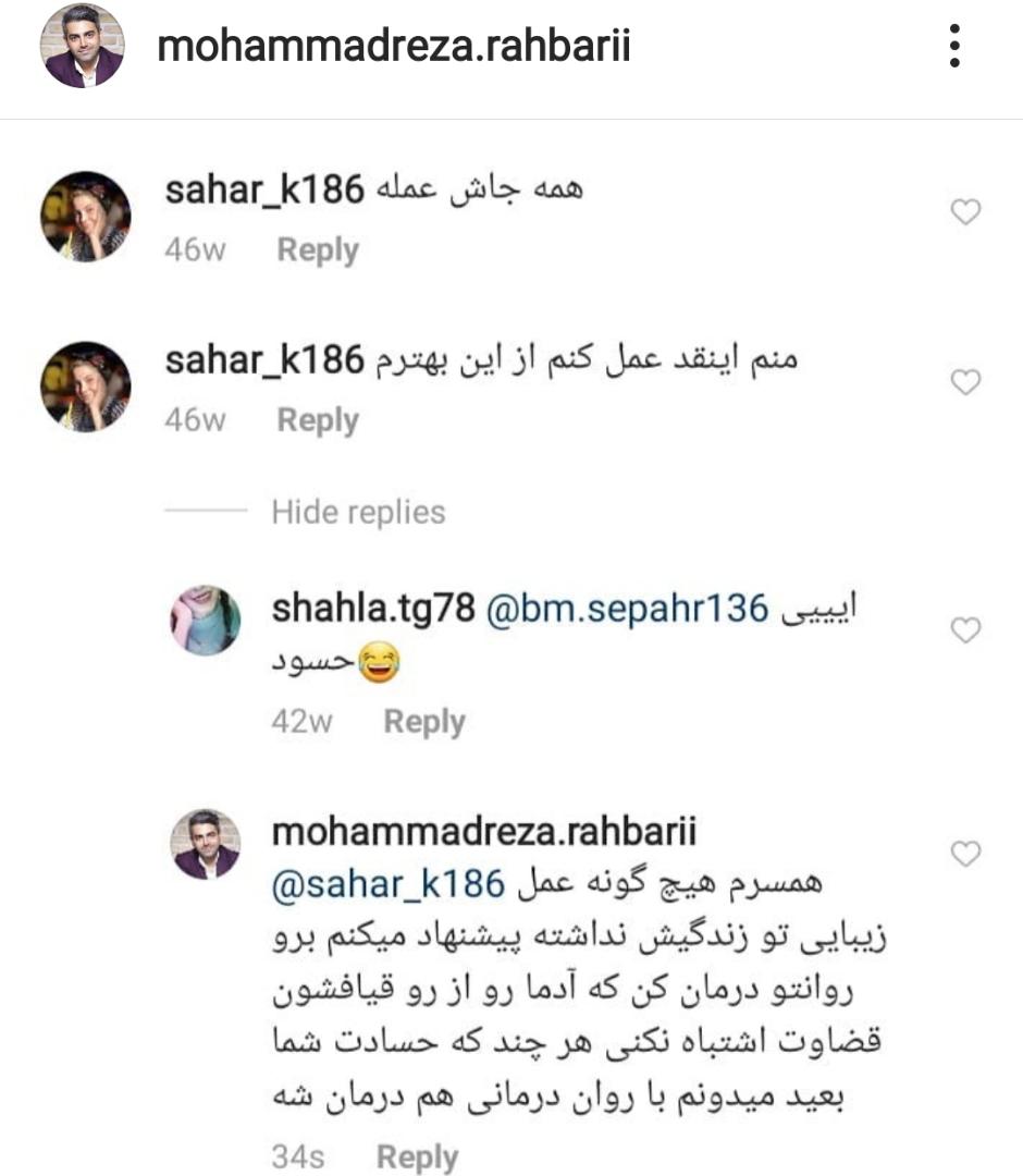 محمدرضا رهبری در اینستاگرام حدود 40 هزار نفر دنبال کننده دارد و نسبتا فعال است، پس از انتاشر عکس همسرش با کامنتها و واکنش کاربران مواجه شد، که آنها را بی پاسخ نگذاشت. وی در ادامه با انتشار این تصویر نوشت: