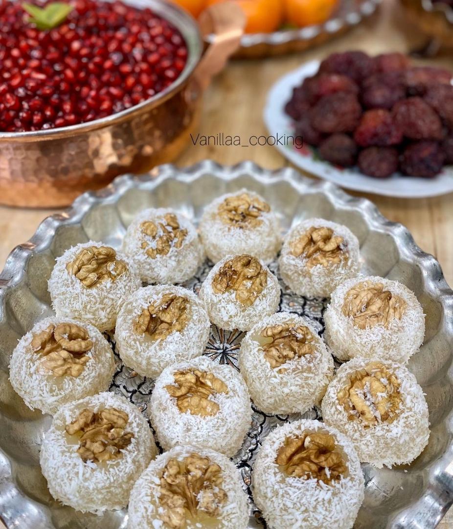 مرحله ششم- مقداری پودر نارگیل روی سینی یا کاغذ روغنی بریزید.