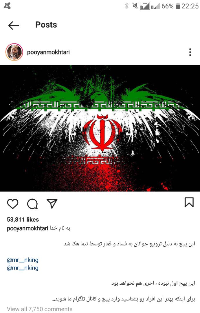 لحظاتی پیش پستی در صفحه اینستاگرام پویان مختاری منتشر شد که خبر از هک شدن این صفحه شخصی میداد. این پست با عکسی که نمایانگر پرچم ایران بود، در صفحه رسمی پویان مختاری قرار گرفت.