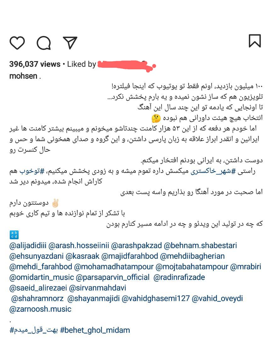 محسن یگانه با انتشار پستی در صفحه اینستاگرام خود ا ز صد میلیونی شدن بازدید آهنگاش در یوتیوب ابراز خوشحالی کرد.