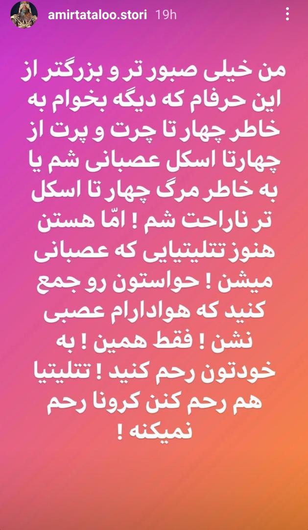 من خیلی صبورتر و بزرگتر از این حرفام که دیگه، که بخوام بخاطر چهارتار چرت و پرت از چهار تا اسکل عصبانی بشم،یا بخاطر مرگ چهار تا اسکل تر ناراحت شم! اما هنوز هستن تتلیتیهایی که عصبانی میشن! حواستون رو جمع کنید که هوادارام عصبانی نشن، فقط همین، به خودتون رحم کنید. تتلیتیها رحم کنن که کرونا رحم نمیکنه."