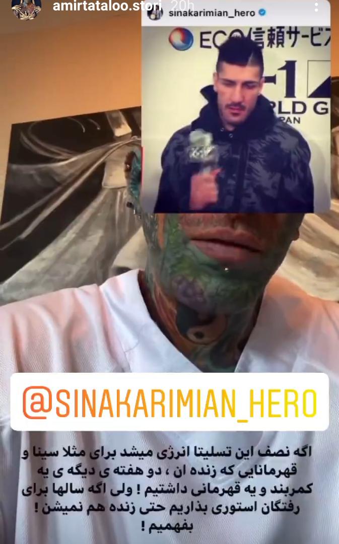 تتلو با گفتن این جملات سینا کریمیان را تگ کرده است. سینا کریمیان قهرمان کیک بوکسینگ است، که رابطه دوستی نزدیکی با امیر تتلو دارد.
