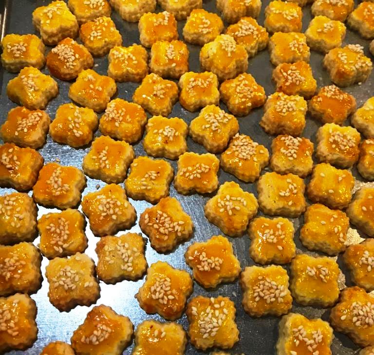 در نهایت روی شیرینی ها رو زرده تخم مرغ میمالیم با قلمو ورویش کنجد میپاشیم و در فر از قبل گرم شده با دمای ۱۶۰ درجه به مدت ۱۵ الی ۲۰ دقیقه میپزیم.