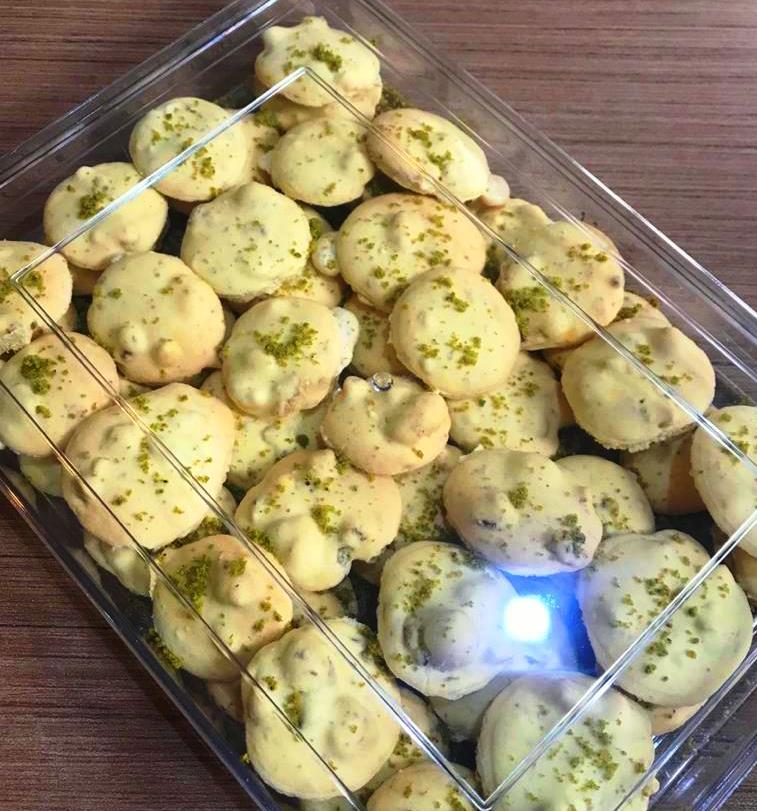 وبعد بین دو کیسه، خمیر را با وردنه باز میکنیم وقالب میزنیم. ومرتب در سینی فر که کاغذی انداختیم میچینیم ودر فرِ از قبل گرم شده با دمای ۱۵۰ درجه به مدت بیست دقیقه میپزیم وبعد از خنک شدن جدا میکنیم. در صورت تمایل روی هر شیرینی قبل از پخت یک یا دو عدد خلال پسته میگذاریم.