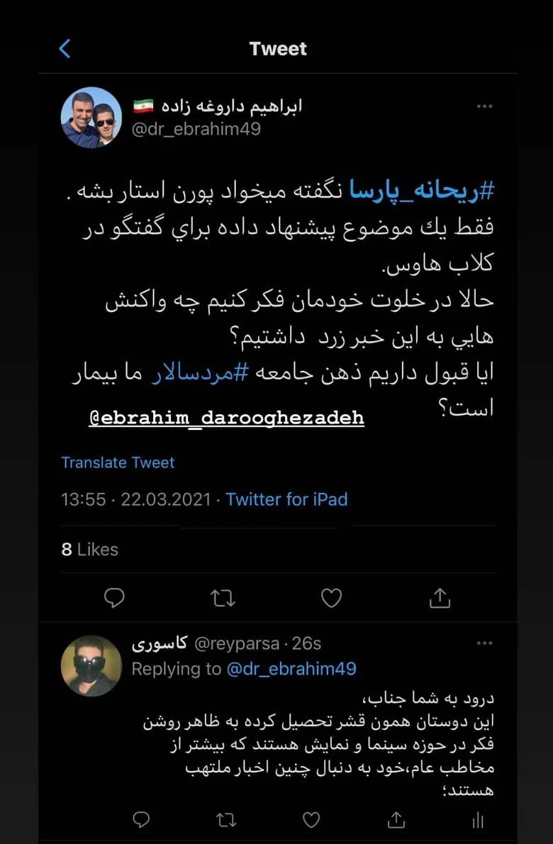 داروغه زاده نوشته بود: «ریحانه_پارسا نگفته میخواد پورن استار بشه . فقط یک موضوع پیشنهاد داده برای گفتگو در کلاب هاوس. حالا در خلوت خودمان فکر کنیم چه واکنش هایی به این خبر زرد داشتیم؟ ایا قبول داریم ذهن جامعه #مردسالار ما بیمار است؟»