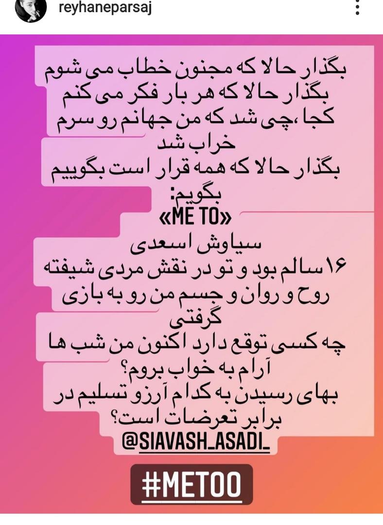 ریحانه پارسا طی چند استوری در صفحه شخصی خود ادعا نمود که مورد تعرض سیاوش اسعدی کارگردان سینمای ایران قرار گرفته است؛او چنین نوشت:«بگذار حالا که مجنون خطاب می شوم؛بگذار حالا که هر بار فکر می کنم کجا،چی شد که من جهانم روی سرم خراب شد،بگذار حالا که همه قرار است بگوییمme to؛سیاوش اسعدی،۱۶ سالم بود و تو در نقش مردی شیفته روح و روان و جسم من رو به بازی گرفتی؛چه کسی توقع دارد اکنون من شب ها آرام به خواب بروم؟بهای رسیدن به کدام آرزو،تسلیم در برابر تعرضات است؟»