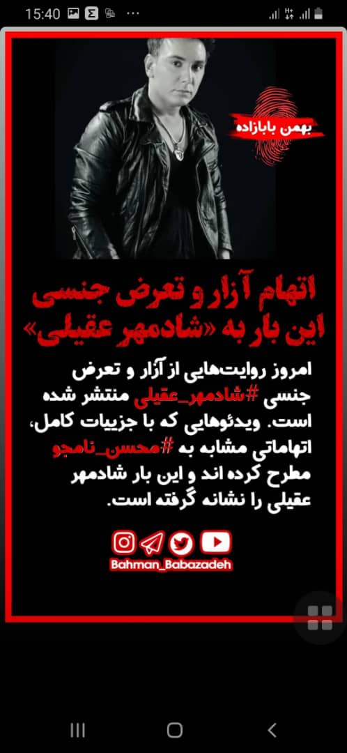 امروز روایتهایی از آزار و تعرض جنسی #شادمهر_عقیلی منتشر شده است. ویدیوهایی که با جزئیات کامل، اتهاماتی مشابه به #محسن_نامجو مطرح کردهاند و این با شادمهر عقیلی را نشانه گرفته است.
