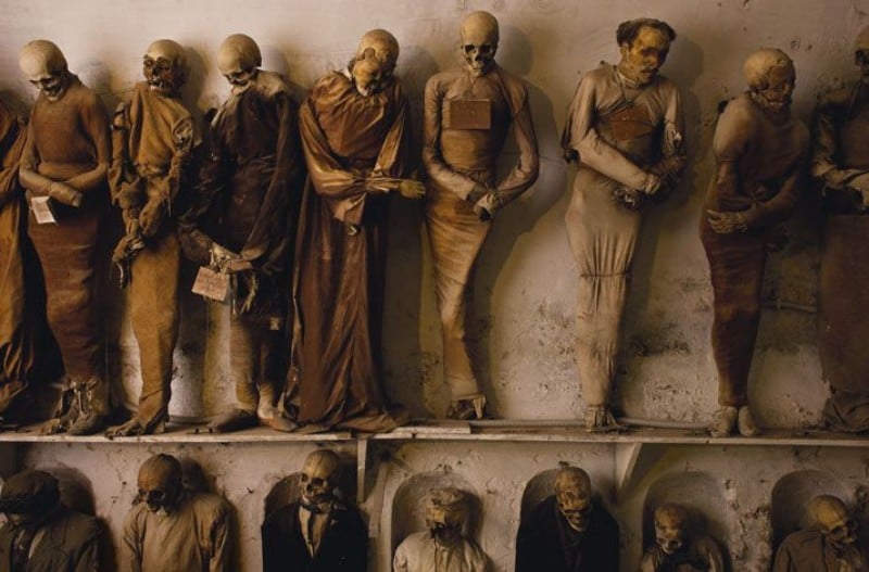 در این مقبرهها حدود ۸ هزار بدن مومیایی شده وجود دارد که بسیاری از آنها به طور ترسناکی از دیوارها آویزان شده اند. در ۱۹۲۰ یک دختر دوساله به نام رزالیا لومباردو در اینجا دفن شد و همانطور که در تصویر میبینید بدن او به خوبی حفظ شده است.