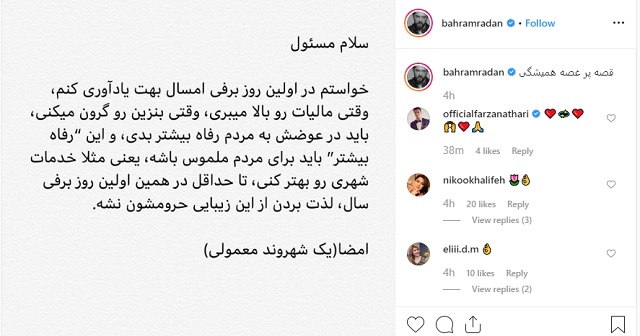 بهرام رادان هم این پست را در صفحه شخصی خود منتشر کرد.