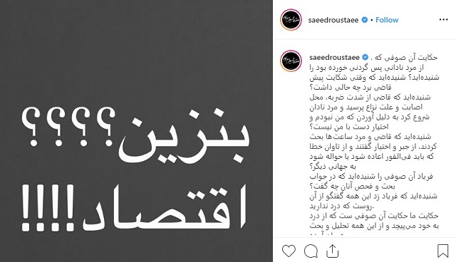 سعید روستایی، کارگردان فیلمهای "ابد و یک روز" و "متری شیش و نیم" نیز نوشت: "حکایت آن صوفی که از مرد نادانی پس گردنی خورده بود را شنیدهاید؟ شنیدهاید که وقتی شکایت پیش قاضی برد چه حالی داشت؟