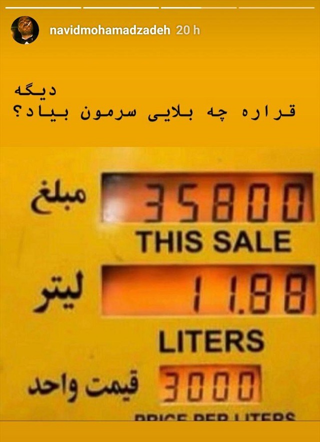 نوید محمدزاده نیز به افزایش قیمت بنزین واکنش داد و در بخش استوری اینستاگرامش نوشت: "دیگه قراره چه بلایی سرمون بیاد؟"