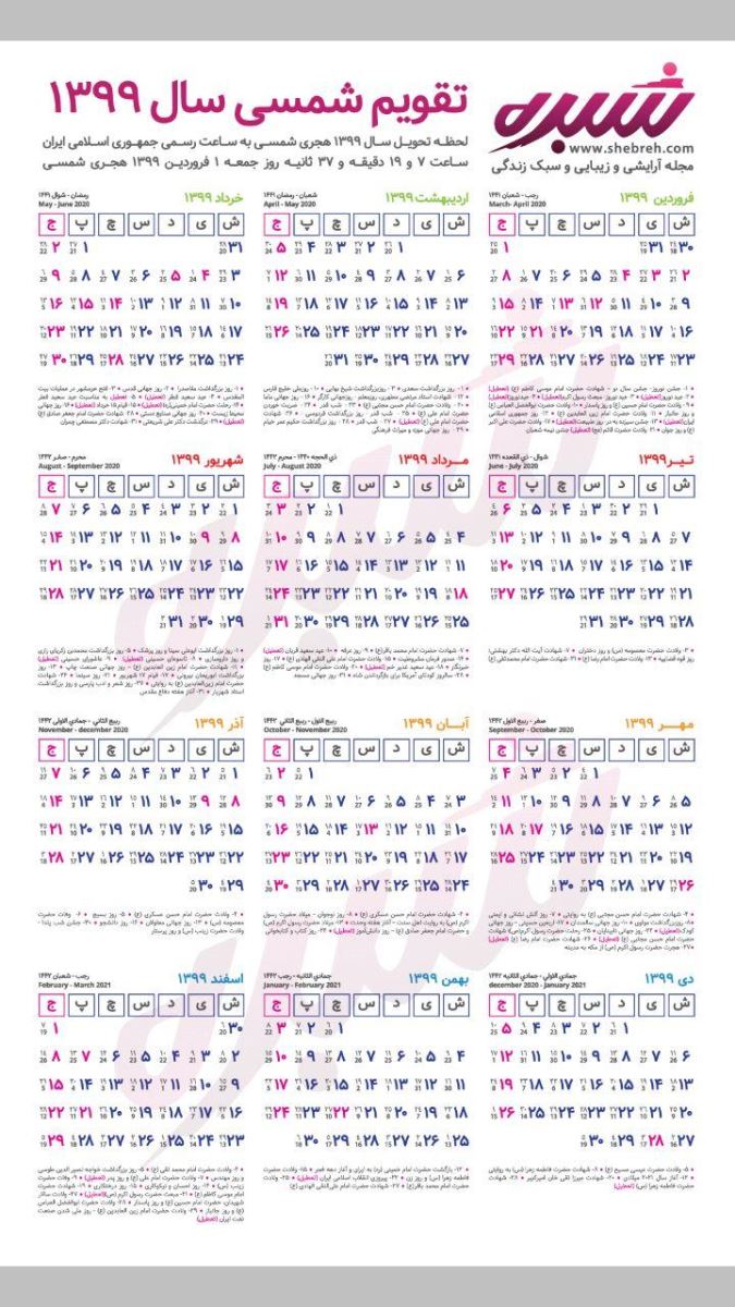 تقویم سال 1399 به همراه تعطیلات رسمی و ساعت تحویل سال