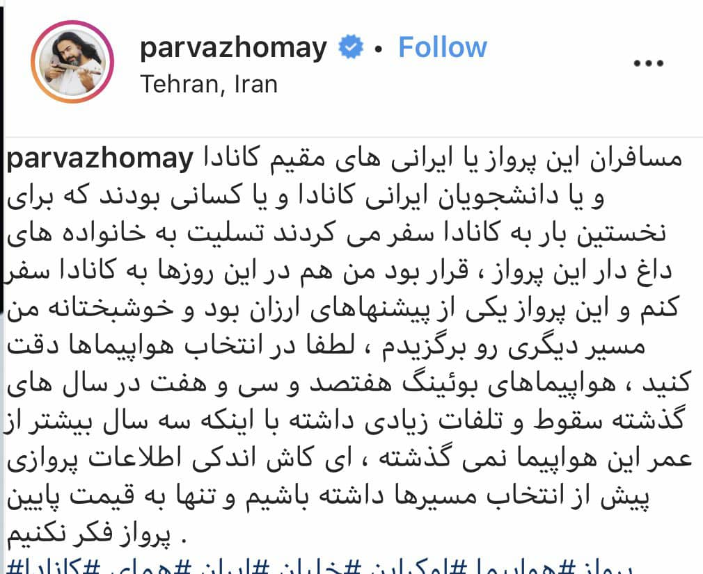 چندی پیش پرواز همای در پستی اعلام کرده بود که او هم قرار بود با هواپیمای اوکراینی راهی کانادا شود ولی مسیر پروازش را تغییر داد و از مردم خواست در انتخاب پروازها فقط به قیمت پایین پرواز فکر نکنند!