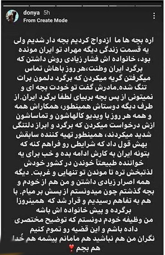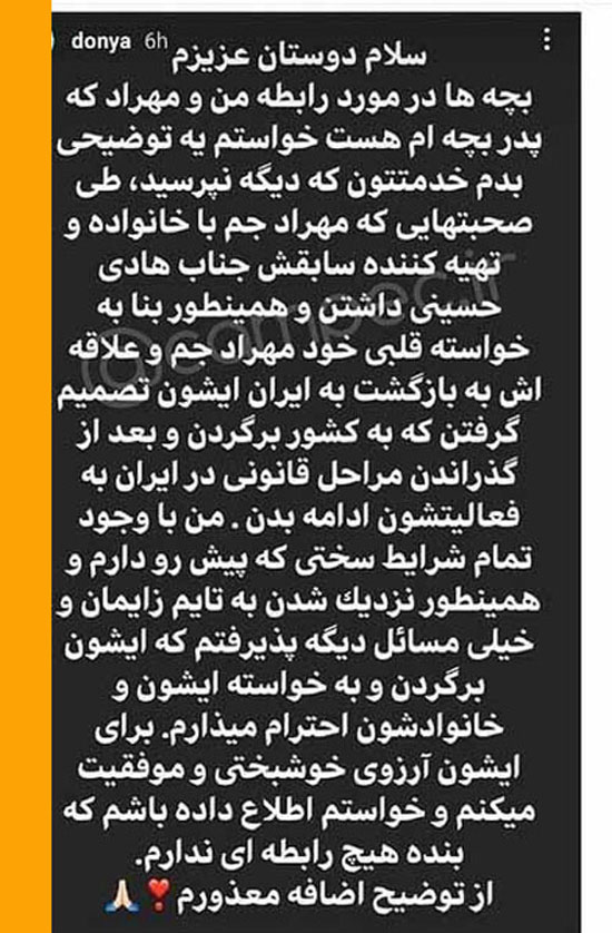 استوری دنیا جهانبخت و پایان رابطه اش با مهراد جم خبرساز شد و این زوج بعد از چند ماه راطه عاشقانه و داشتن یک فرزند حالا در ۱۴ شهریور ۱۴۰۰ با یک استوری خبر از جدایی و پایان رابطه اشان دادند.