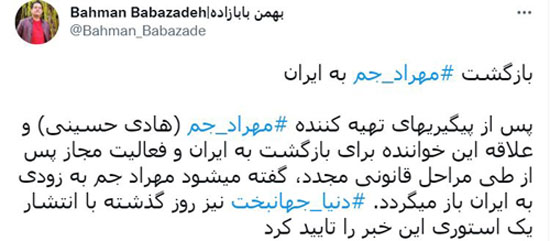 بهمن بابازاده خبرنگار حوزه موسیقی نیز در توئیتر خود نوشت: پس از پیگیریهای تهیه کننده مهراد جم (هادی حسینی) و علاقه این خواننده برای بازگشت به ایران و فعالیت مجاز پس از طی مراحل قانونی مجدد، گفته میشود مهراد جم به زودی به ایران باز میگردد. دنیا جهانبخت نیز روز گذشته با انتشار یک استوری این خبر را تایید کرد.