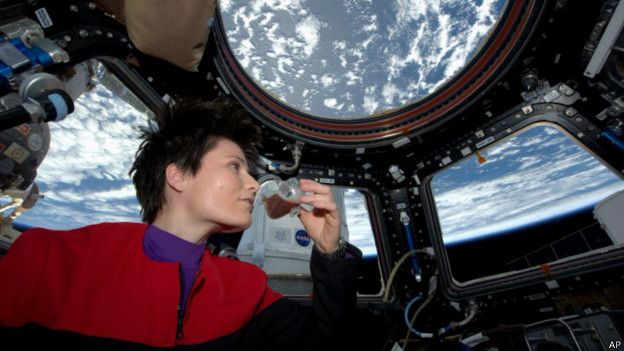 ادرار فضانوردان بازیافت شده و بصورت آب برای نوشیدن فضانوردان استفاده میشود.