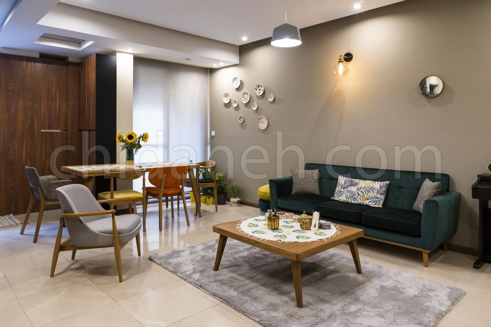 در دکوراسیون نشیمن یک کاناپه سه نفره با پارچه رومبلی مخملی و به رنگ کله غازی دیده می شود که با مبل تک نفره طوسی ست نشیمن را کامل می کنند. میز مربعی جلو مبلی هم همراه با فرش مدرن طوسی رنگ، از دیگر وسایل اصلی این خانه هستند.