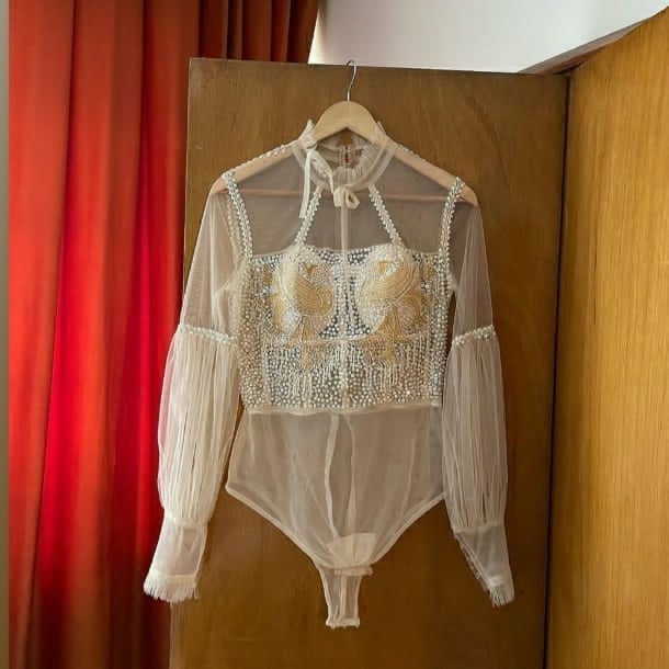 حالا به تازگی تصویری از یک لباس نه چندان معقول منتشر شده که به گفته برخی کاربران لباس عروس فرشته بوده اما صحت این مطلب هنوز توسط منبع موثقی تایید نشه است. ناگفته نماند ظاهرا این تصویر تنها قسمت بالای لباس عروس خانم می باشد و احتمالا در قسمت پایین تنه آن دامن بلندی قرار می گیرد. در ادامه تصویر این لباس را مشاهده می کنید.