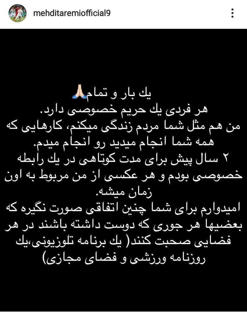 مهدی طارمی نوشت: یک بار و تمام. هر فردی یک حریم خصوصی دارد. من هم مثل شما مردم زندگی میکنم، کارهایی که همه شما انجام میدید رو انجام میدم. 2 سال پیش برای مدت کوتاهی در یک رابطه خصوصی بودم و هرعکسی از من مربوط به اون زمان میشه.